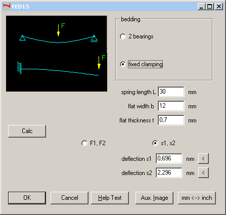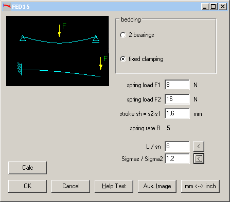 In FED15, you can choose between "fixed clamping" and "2 bearings". Also the load introduction positions are predefined: for fixed clamping at spring end, and for two beddings in the middle of the spring. FED15 input with spring loads F1, F2 and spring deflection s1, s2 is similar than in other spring programs, whereas FED10 input rather is comparable with shaft calculation WL1+ and girder calculation TR1.