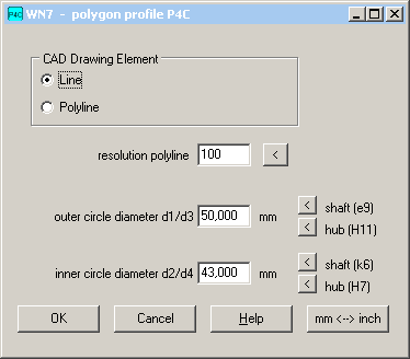 New at CAD->P4C, you can create true-scale P4C profile as DXF or IGES file and load in CAD. P4C profile is no continuous cycloid curve as in WN6. The P4C cycloid curve is limited by external diameter d1 (shaft profile) or d3 (hub profile) The P4C profile consists of 4 parts of a cycloid curve and 4 circular arcs with d1/d3. In DIN 32712, cycloid curve is approximated by radius r = d2/2 + 16e. P4C profile in FED14 can be generated as LINE/ARC or as POLYLINE, resolution of the cycloid curve can be configured. By means of the "<" buttons you can set d1/d3 and d2/d4 in tolerance center, or you can self define the values for inner and outer diameter of the profile.