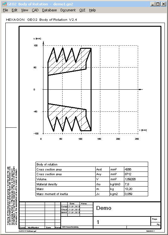 Instead of half-section, production drawing shows now full section of the rotation body. Because the area of full section is double value, table with results lists now both, rotation area (Arot) and section of the body (Axy).