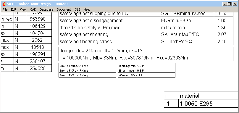 If you open old calculations with a new versions of SR1 or SR1+, maybe you get error messages like "mzu<0.8P" and warnings "mzu < 2P" and "SG < 1.2". In the old VDI 2230-1:2003, calculation of minimum engaged thread length considered a non-bearing thread length of 0.8 thread pitch. In the new version of 2014, non bearing thread length "mzu" can be self-defined (recommended 2 * P). In earlier versions of SR1 and SR1+, you could input non-bearable thread length, only the term "mzu" is new. And input of 0 caused no warning.