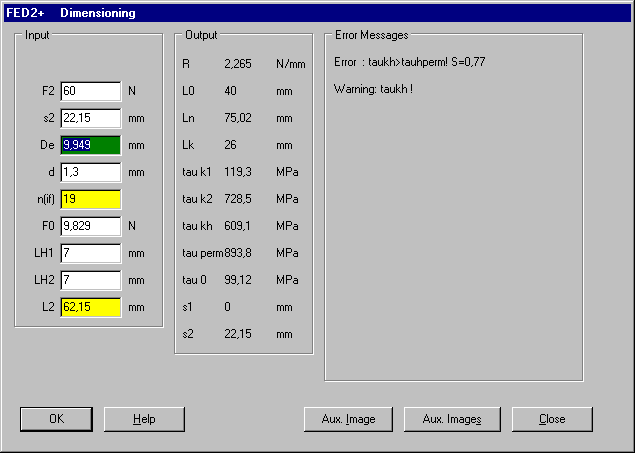 A green input field means that the entered value is only approximate, it may be rounded or changed. This is the case for extension springs and torsion springs, where calculated number of coils must be rounded to loop position or leg angle, and the rest must be compensated by modified coil diameter.