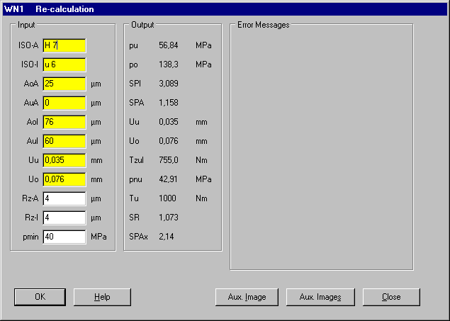Recalculation of cylindrical press fits with WN1 has many yellow fields: Input of ISO tolerances calculates tolerances A and then interference U of shaft and hub fit. Modification of tolerances A clears ISO tolerance. And modification of interference U clears all, tolerances A and ISO tolerances.