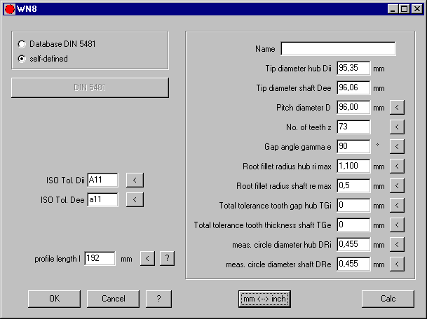 For self-defined splines you can now input ISO tolerance for tooth tip diameter of internal and external spline. If nothing entered, diameters are calculated without tolerance. If you select profile from DIN 5481 database, ISO tolerance A11 will be set for internal spline and a11 for external spline. In self-defined splines, root fillet radius can be set 0 now. In earlier versions, maximum fillet radius was calculated in this case.