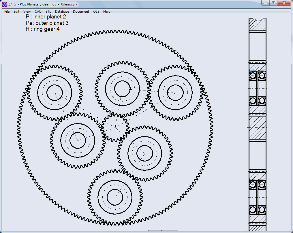 Roller bearings for the planet wheels can be selected from included database, ZAR7 calculates bearing life expectation.