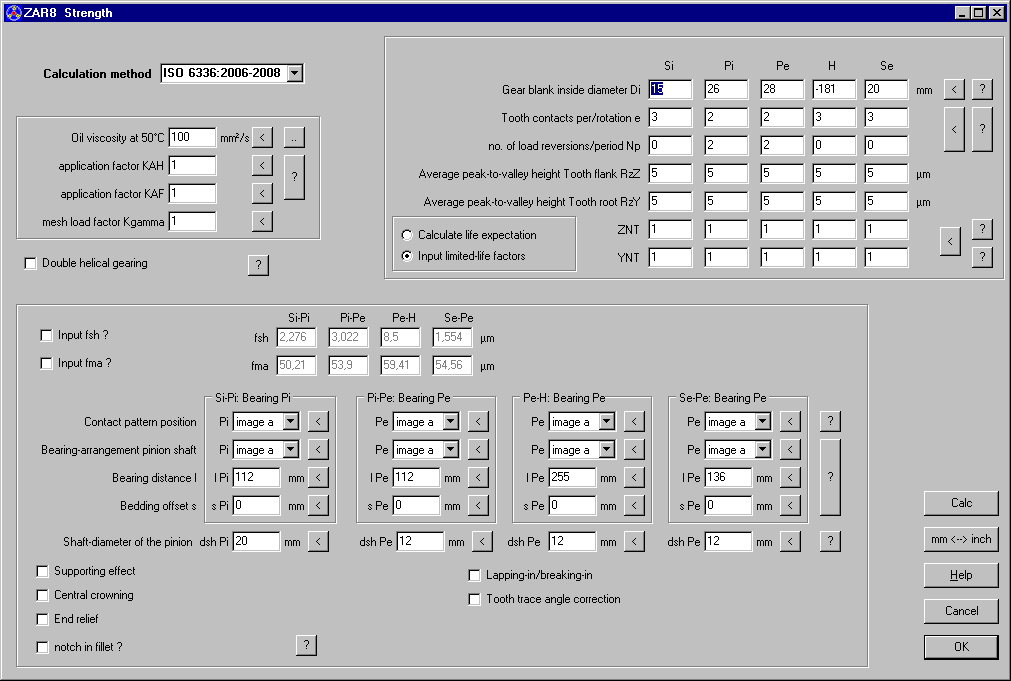 To calculate load bearing capacity for each of the five gear wheels and four tooth contacts (Si-Pi, Pi-Pe, Pe-H, Se-Pe), select gear materials from integrated database and input additional data for strength calculation according to ISO 6336 or DIN 3990.