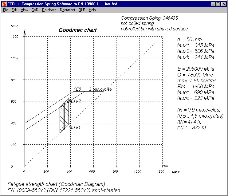 Goodman diagrams for hot-coiled springs are valid for spring materials to EN10089 with ground or shaved surface. At "Edit->Production" you must set "hot-coiled, steel with reworked surface" and at "Edit->Material->Surface" "ground" or "shaved". For hot-rolled spring steel with drawn or rolled surface is no Goodman diagram available. Instead of 3 curves for 10 million, 1 million and 100,000 load cycles, new Goodman diagram for hot-rolled springs shows only 2 curves: for 2 million cycles and 100,000 cycles.
