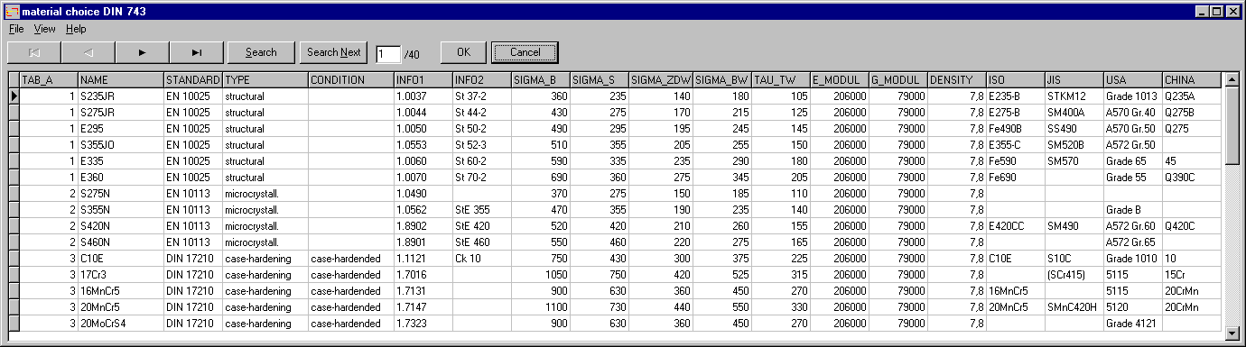 Material numbers and material names to ISO, JIS, US and Chinese standards have been added to DIN 743 material database. If you use materials from WST1 database in WL1+, you can search for international material names in the WST1 material comparison database.