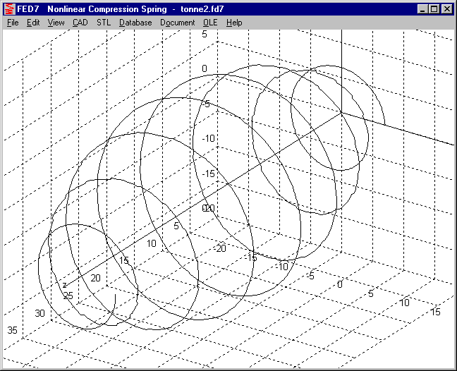 3D centerline has been added in FED7 as drawing on screen, or to be exported as 3D DXF or IGES file to be used with CAD. Because FED7 calculates a compression spring of any form as series of cylindrical spring sections, center line may be less or more disintegrated if coil diameter changes.