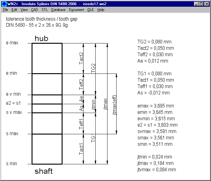 Until now WN2+ printed allowable deviations according to DIN 3961 for involute gears and splines. This was replaced now by deviations fp, Fp, Falpha, Fß and Fr according to DIN 5480:2006.