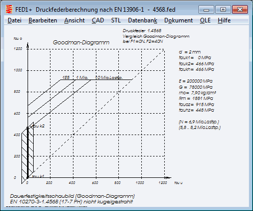In der Beispielberechnung mit F1=30N und F2=70N ist der Unterschied im Goodman-Diagramm deutlich erkennbar. Die Feder aus 1.4568 ist dauerfest, während die Feder aus 1.4310 nach 300.000 Lastspielen bricht.