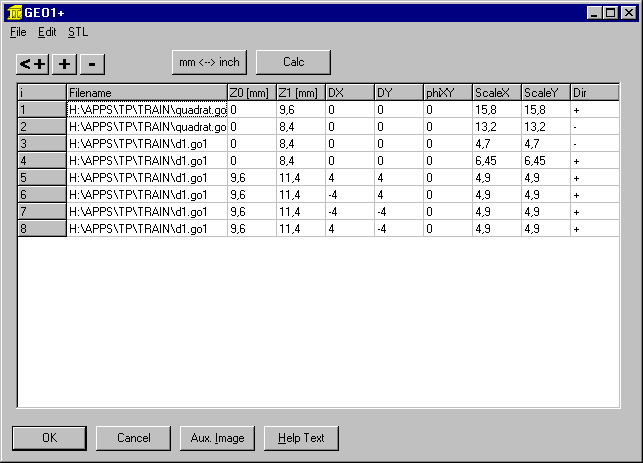 For each GEO1 element, you can define position, scale and direction. This is very practical, so you can work with only few base profiles. For example, a circle with diameter of 1mm can be used for each cylinder and bore, because diameter is entered as scale. With direction "+" as cylinder and inverse direction "-" as cylindrical bore.