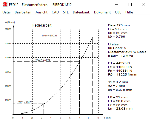 Neu angezeigt wird auch ein Energieausnutzungsgrad = W02/W0n bzw. W02/W0z als Meßgöße, wieviel Energie der maximal nutzbaren Energie der Feder für die Anwendung genutzt wird. Dabei ist zu beachten, daß der Ausnutzungsgrad nur bei statischen Anwendungen 100% sein kann, bei dauerfester dynamischer Anwendung muss der (statische) Energieausnutzungsfaktor kleiner als 100% sein. Bei allen Federn außer Schraubendruckfedern, Tellerfedern und Wellfedern ist der nutzbare Federweg sn und die nutzbare Federenergie Wn durch die zulässige Schub- oder Biegespannung begrenzt. Schraubendruckfedern werden dagegen meist blockfest ausgelegt, so daß die zulässige Schubspannung gar nicht erreicht werden kann, weil die Feder vorher auf Block läuft. Deshalb wird bei Schraubendruckfedern, Tellerfedern und Wellfedern in diesem Fall eine theoretische Federarbeit W0z berechnet, bei der Federkraft und Federweg aus der zulässigen Schubspannung bzw. zulässigen Biegespannung berechnet werden.