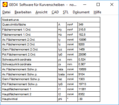 Für Nocken und Unrundzahnräder werden Fläche, Flächenträgheitsmomente und Schwerpunktkoordinaten berechnet. Berechnung und Tabelle wurde aus GEO1 übernommen.