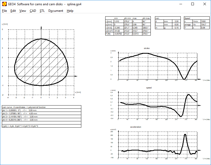 In GEO4 kann man bisher schon Stützpunkte der Nockenkurve eingeben und daraus eine Polynomfunktion generieren. Jetzt kann man die eingegebenen Koordinaten alternativ auch mit kubischen Splines verbinden.