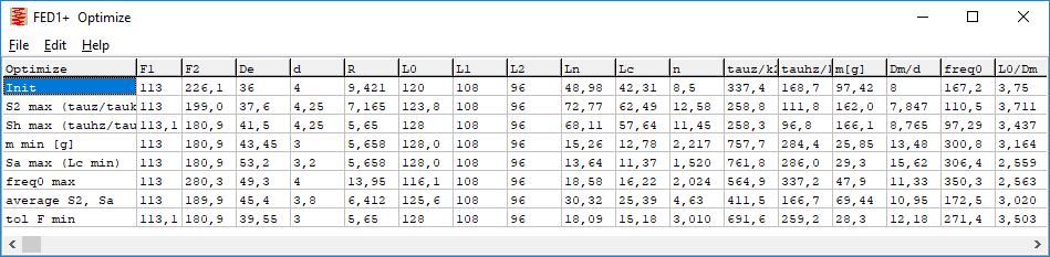 Spring data of the original compression spring have been added at the first row of the table with optimized springs. This simplifies the comparison of the optimized springs with the initial spring.