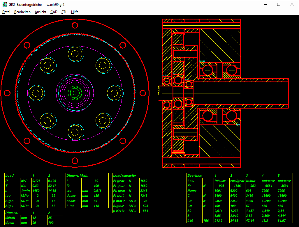 GR2 wird ein neues Berechnungsprogramm für Exzentergetriebe. GR2 berechnet Antriebswelle mit Exzenter, Abtriebswelle mit Bolzenteller und alle 5 Wälzlager. Nicht jedoch die Zahnräder, das kann man mit ZAR1+. Oder man verwendet Zykloiden, Wellgetriebe, oder gar Reibradgetriebe.