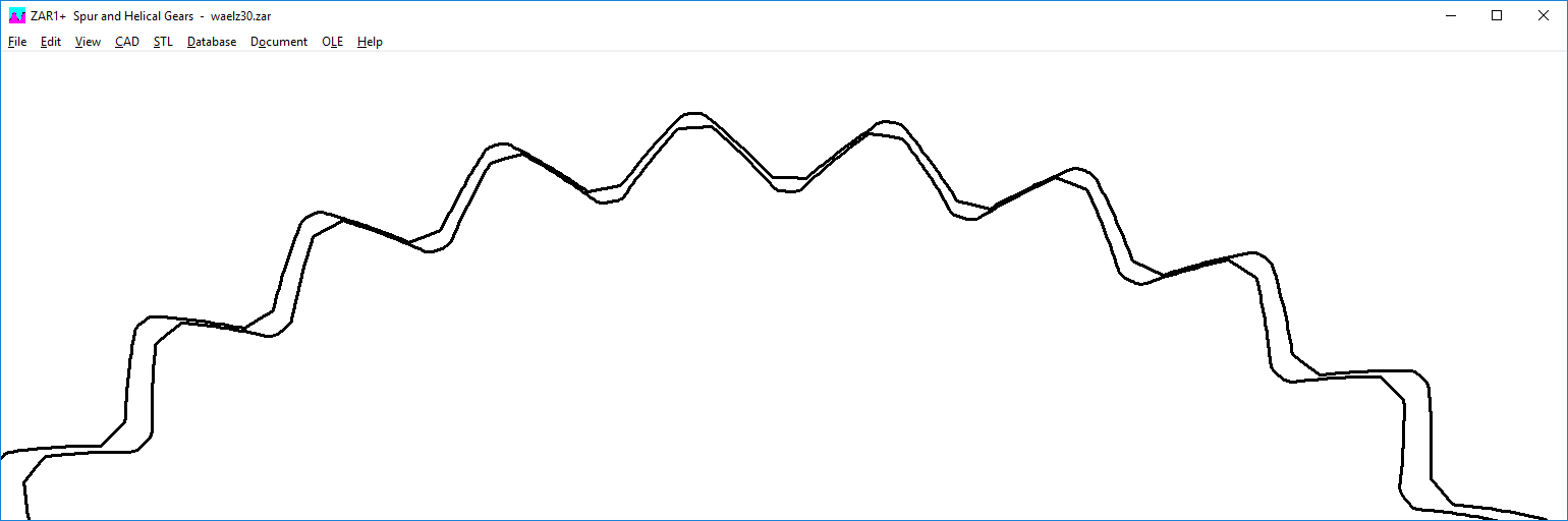 Es gibt keinen Linienkontakt auf der Eingriffsgeraden, dafür 2 Kontakte links und rechts der Eingriffslinie, 2 bis 3 Zähne entfernt. Negativ bezüglich Reibung und Gleiten, aber positiv bezüglich Tragfähigkeit sowie Verdrehflankenspiel und Selbsthemmung. Die Fehlermeldung in ZAR1+ wegen Waelzkreis, Eingriffsgerade und epsilon alpha < 1 muss man halt ignorieren.