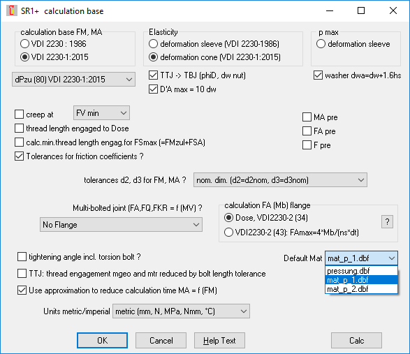 When selecting the materials for clamping plates and nuts, you can choose between the database files pressung.dbf, mat_p_1.dbf and mat_p_2.dbf. The default setting can now be configured under "Edit \ Calculation Method" (Default Mat). If you want to use a database with your own material data, the best way is to use mat_p_1.dbf. This contains material data from VDI 2230: 2003, which you no longer need. If you have not yet used mat_p_1.dbf for previous calculations, you can delete and replace the existing records, otherwise you may append your own data to the bottom. Mat_p_2.dbf contains the materials from VDI 2230:2015, and pressung.dbf contains all old and new material data.