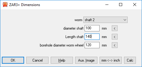 For worm and worm wheel you can enter a bore under "Dimensions 2". For the worm, it can be a shaft rather than a hole. "Shaft 1" is 1 shaft extension on the worm gear (for overhung bearing assembly), and "shaft 2" a shaft on both sides of the worm. The dimensions are used for STL files. When producing a worm with 3D printer, it is better to use only "bore" or "shaft1".