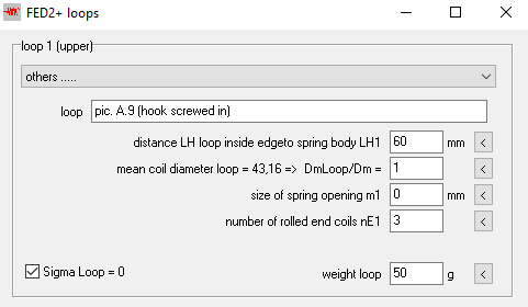 When choosing the loop you can choose "other .." if no loop according to EN standard is used. So far, the bending stress and reference stress at the loop transition area had also been calculated. However, if the loops are rolled up or screwed in, the bending stress at the loop transition must not be taken into account. Now you can use "SigmaLoop = 0?" Mark with a cross. Also for suspended loops (e.g. HiSo spring from Hirsch-Federn) the loop stress is relatively lower than the torsional stress in the spring body due to the connected end of the loop (fix-loose bearing).