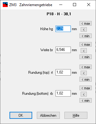 In ZM3 verwenden wir ähnlich wie bei Kettentrieben eine Bruchkraft FB. Bei Zahnriemen hängt diese von den eingearbeiteten Zugsträngen (aus Stahl, Glasfaser, Carbon) ab. Als Vorgabe für FB verwenden wir FB = 50*(hs-ht)*b, das entspricht einer mittleren Spannung von 50 MPa im Riemenquerschnitt. Wenn der Anteil der Zugstränge am Querschnitt 20% beträgt, entspricht das einer Zugspannung von 250 MPa.