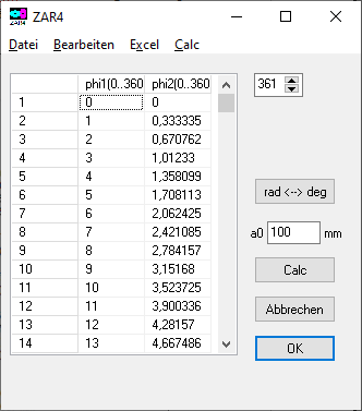 Als neue Option für die Teilkurve kann man jetzt auch die Winkel von Antriebsrad und Abtriebsrad eingeben. Dafür die Winkel phi1 in 1°-Schritten oder kleiner und die gewünschten Winkel phi2 vom Gegenrad phi2 eingeben. ZAR4 berechnet dann die Teilkurven von Rad1 und Rad2: