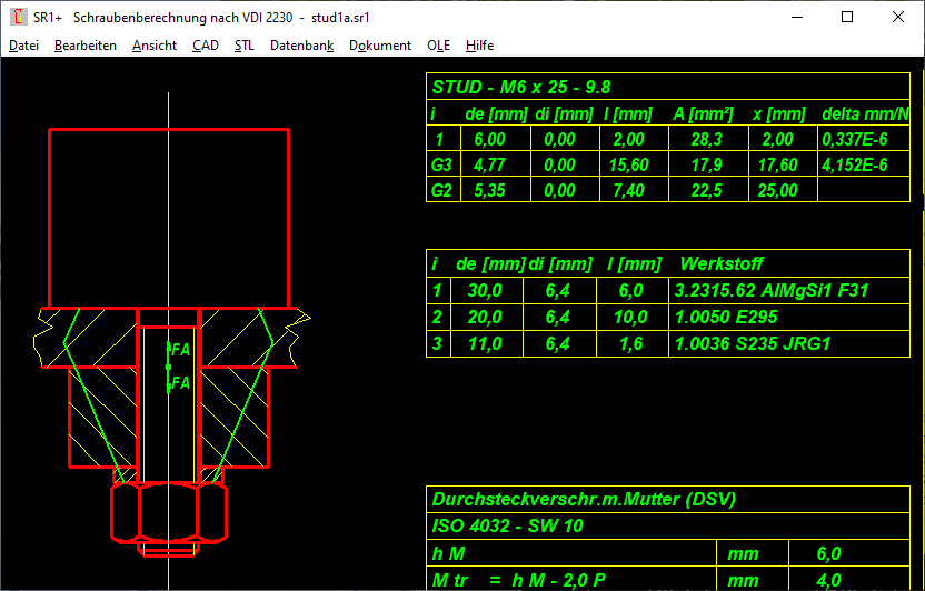 Des öfteren wird gefragt, wie man einen eingeschraubten Gewindebolzen mit Mutter berechnen kann. Wenn das zuerst eingeschraubte Gewinde nicht berechnet werden muss, ist das einfach: Der eingeschraubte Bolzen wird als Schraube definiert mit einem großen Sonderkopf.