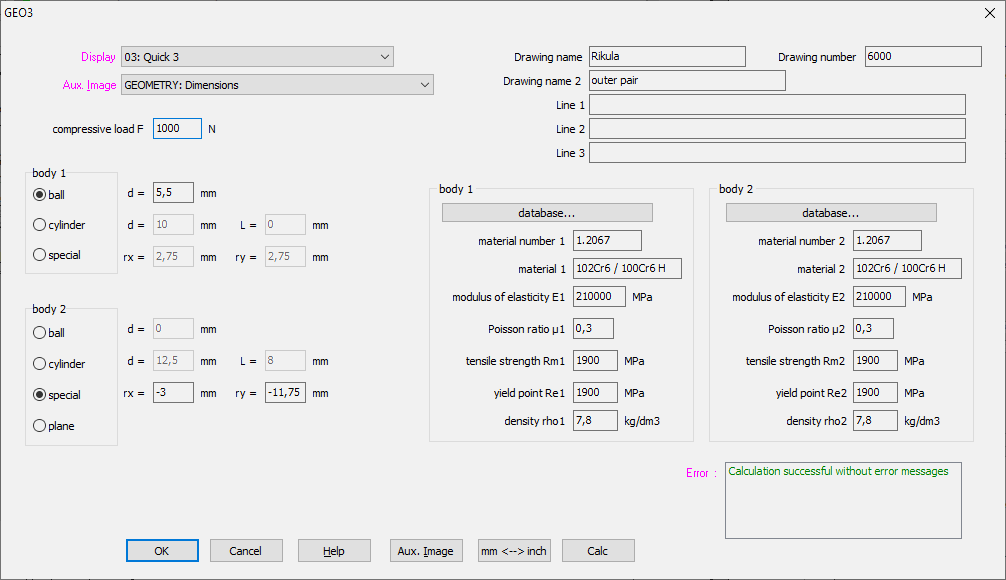 If the Hertzian pressure between spheres or cylinders is to be determined, GEO3 now also calculates the compression of the bodies, as well as the total spring rate, taking into account the compression of the ball or cylinder.