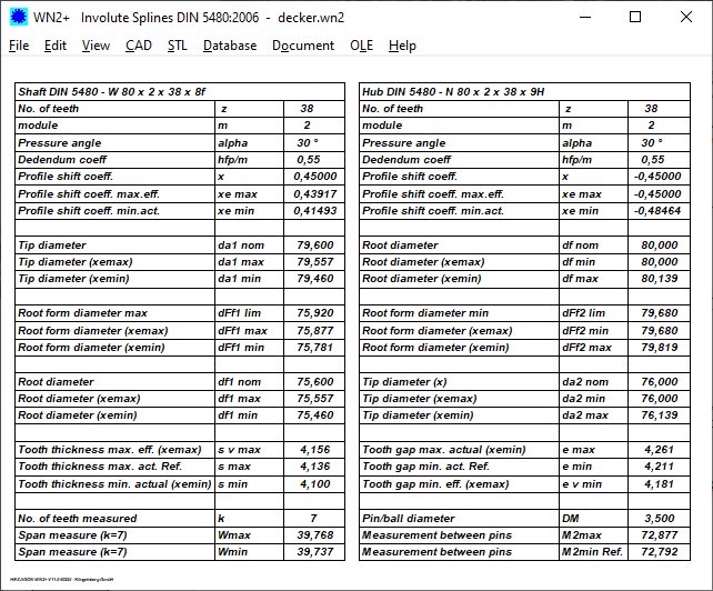 In WN2, the tooth gap tolerances of the selected tolerance field were used until now. In fact, the tolerances from series 9H and a11 must always be used. The table also contains the theoretical nominal dimensions of the tip and root diameter. Instead of the calculated maximum diameter. This has been corrected, the root diameter tolerances are now even greater. Nothing changes in the gear data. The tip and root circle tolerances from tooth thickness dimensions and tooth height factors are much smaller and are well within the DIN 5480 tolerances. According to Chapter 7.1 in DIN5480-1: 2006, the dimensions of the root diameter must be reduced if hfp = 0.6m or hfp = 0.65m instead of hfp = 0.55m. Adapted formulas: