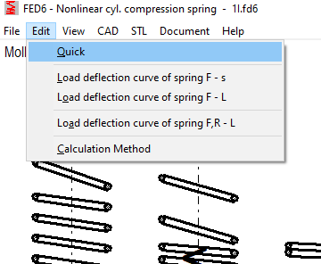 Dimensioning of a spring by definition of the progressive spring characteristic curve is not covered by the Quick Input. For this case, use the menu items "Spring characteristic F-s", "Spring characteristic F-L" or "Spring characteristic F-R, L" in the Edit menu. Under "Help \ Expert Mode" you can switch off the expert mode, then only the absolutely necessary menu items are displayed.