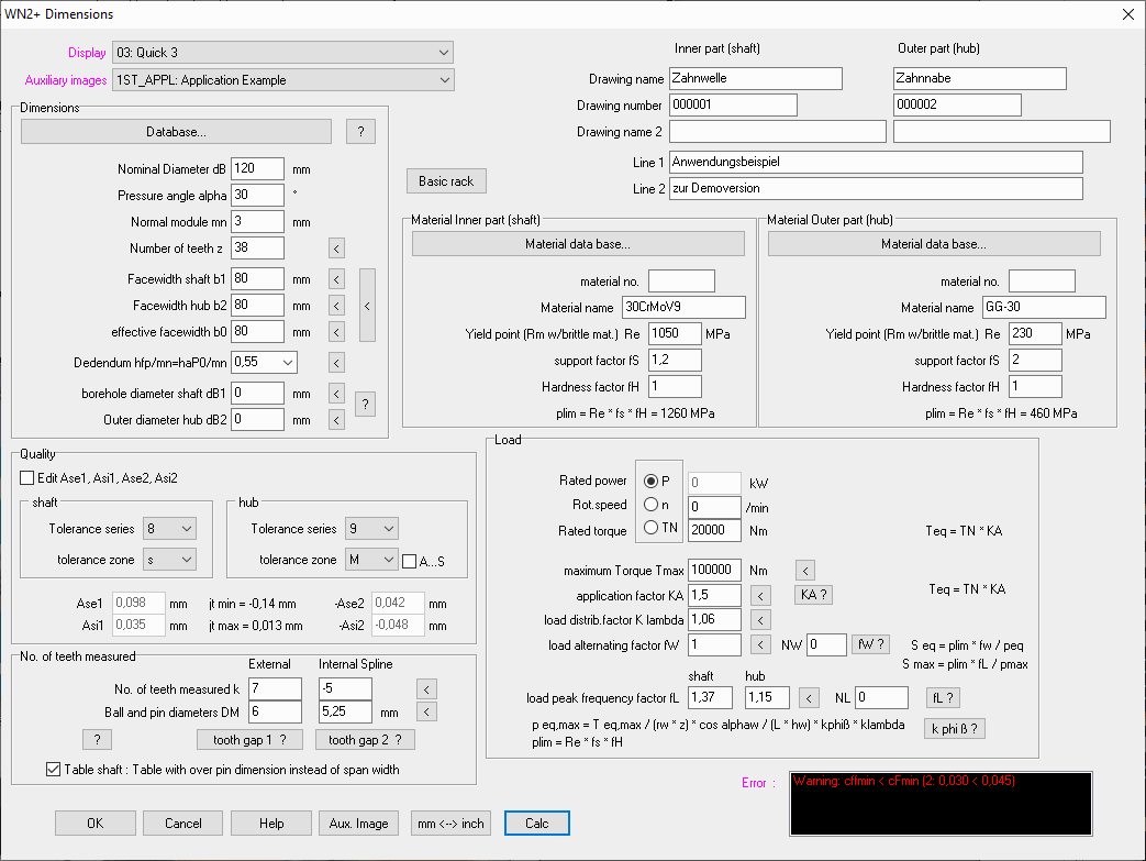 If a large backlash is selected, then not only the tooth thickness but also the tip and root diameter are smaller when manufacturing using the hobbing process. If the tip diameter becomes smaller than the lower limit of the ISO tolerance h11 (H11 for internal gearing), there is now a new error message. To avoid the warning, the backlash can be distributed over the shaft and hub. Example: Tolerance pairing D7 / c7 instead of H7 / a7.
