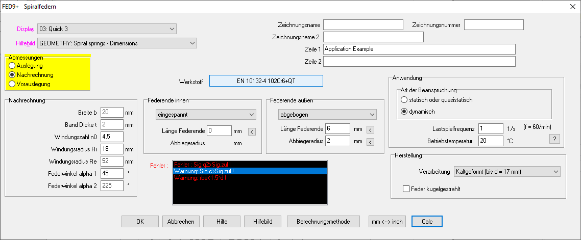 In der Quick-Eingabe wurden alle Eingabefenster in einem großen Fenster zusammengefasst. Mit "Calc" wird die Feder berechnet und die Ergebnisse im Hintergrundfenster angezeigt.