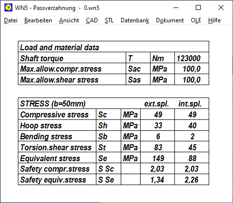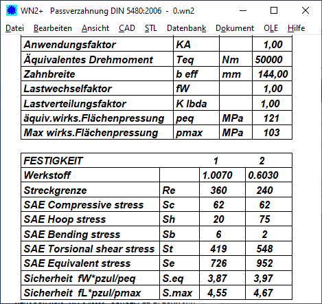 Die Festigkeitsberechnung in WN2+ und WN10 beschränkte sich bisher auf die Flächenpressung an den Zahnflanken und die Torsionsspannung der Welle, und das nach verschiedenen Methoden: nach Niemann(2005), nach Niemann (1981), nach Roloff/Matek. Jetzt kommt noch die Berechnung nach SAE Design Guide hinzu. Von DIN 5466 gabe es schon mehrere Entwürfe speziell für Paßverzahnungen nach DIN 5480, aber diese wurden allesamt wieder zurückgezogen. Es ist nicht gelungen, Spannungsverteilung, Kerbfaktoren, Maximalspannung analytisch zu berechnen, passend für beliebige Größen.