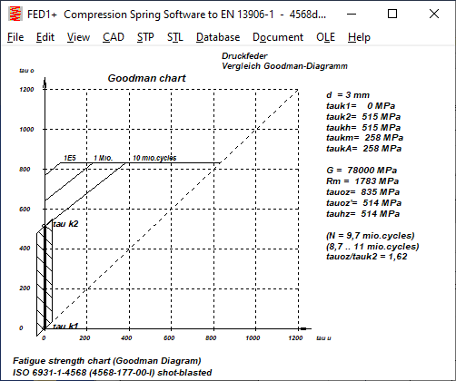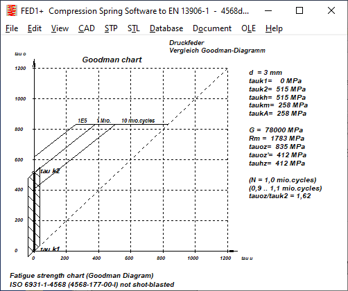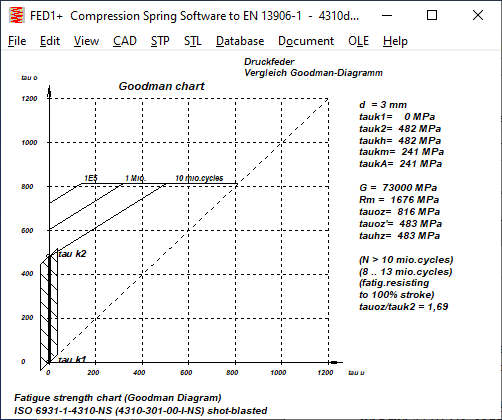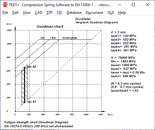 Theoretisch sollte die obere waagrechte Linie im Goodman-Diagramm die zulässige (statische) Schubspannung tauz sein, weil hier der zulässige Hub=0 ist. Tatsächlich liegt dieser Wert bei den Goodman-Diagrammen in EN 13906-1 meist niedriger. Man kann aber unter "Bearbeiten\Berechnungsmethode" "tauoz=tauz" setzen, dann ist die Oberspannung im Goodman-Diagramm die zulässige Schubspannung tauz.