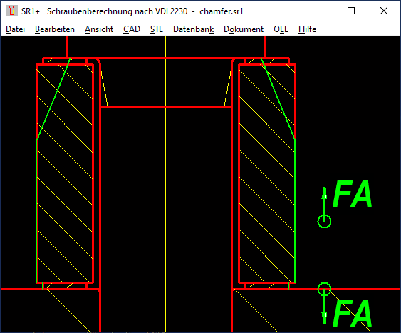 Wenn eine Senkung oder Fase für die Berechnung von Flächenpressung und elastischer Nachgiebigkeit zu berücksichtigen ist, macht man aus dem Klemmstück mit Senkung oder Fase zwei zylindrische Klemmplatten: eine mit Senkung und eine ohne. Oder aus einer Klemmplatte enstehen sogar drei, wenn beidseitig Fasen oder Senkungen berücksichtigt werden sollen. Ausgehend von einer 45° Fase, gibt es eine neue Klemmplatte mit der Höhe der Fase, die alte Klemmplatte wird um dieselbe Höhe reduziert. Bei 45°-Fase am Bohrungsdurchmesser vergrößert sich Di um 2*Fasenhöhe, bei 45°-Fase am Außendurchmesser verringert sich De um 2*Fasenhöhe. Das geht jetzt auch automatisch unter "Bearbeiten\Klemmplatten" "Fase, Senkung".
