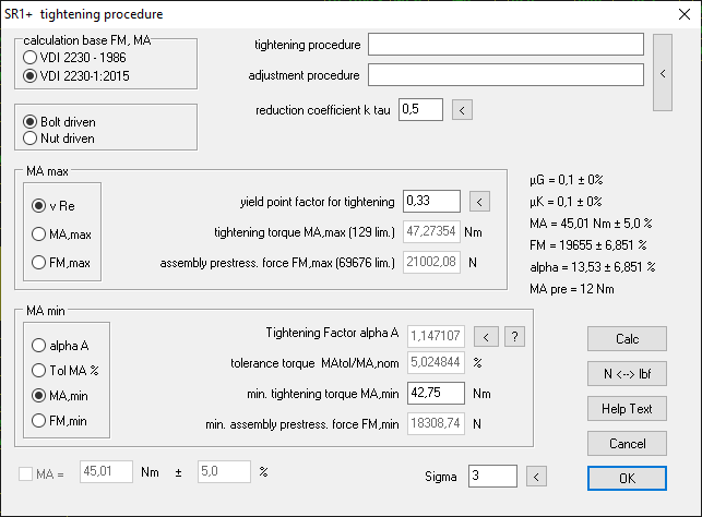 Bei selbstsichernden Muttern mit Reibmoment muss der Streckgrenzenfaktor nueRp eingegeben werden, die Eingabe von MA,max sowie MA +/- % ist hier nicht möglich. Man kann in diesem Fall nueRp verändern, bis im Hintergrund das gewünschte Anziehdrehmoment MA,max angezeigt wird.