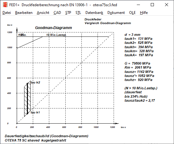 Praktische Auswirkung auf die Lebensdauerberechnung hat der geänderte Zeitfestigkeitsfaktor hier nur, wenn die Vorspannung klein (tauk1<300MPa) und die Hubspannung sehr groß ist (taukh>900 MPa). Bei höherer Vorspannung (tauk1>300) wird der Hub durch die (statisch) zulässige Schubspannung begrenzt, und bei kleinerer Hubspannung (taukh<900) ist die Feder dauerfest für tauk1<300 MPa (Zahlenwerte gelten nur für dieses Beispiel von Oteva 75, d=3mm, kugelgestrahlt).
