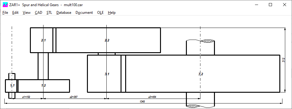 When pre-designing multi-stage gears, the most important dimensions have been added to the drawing: center distances between the stages, overall length, overall width.