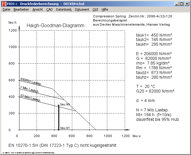 Ebenso kann man jetzt in den Schraubenfederprogrammen ein sogenanntes "Haigh-Goodman-Diagramm" anzeigen lassen. Dies ist ein Haigh-Diagramm nur für schwellende Beanspruchung, mit der Unterspannung tauU in der x-Achse und der Hubspannung tauH in der y-Achse.