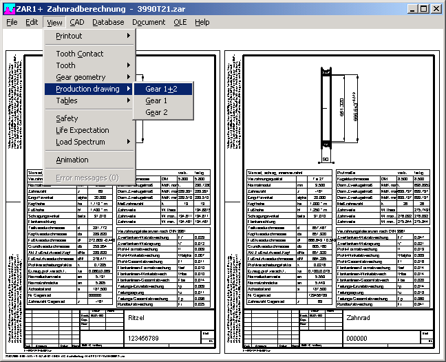 Von Fertigungszeichnung und Tabellen (Verzahnungsdaten, Prüfmaßen und Toleranzen) können jetzt beide Grafiken für Rad 1 und Rad 2 zusammen angezeigt werden.