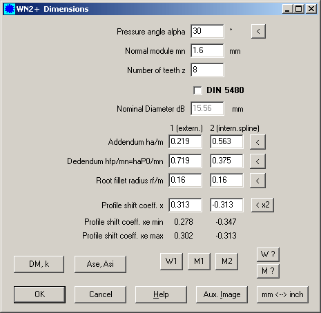 Although DIN 5482 is no longer valid since 1987, people often ask for a software to calculate involute splines according to DIN 5482. You can use WN2+ to calculate DIN 5482 splines. You only have to calculate tooth height coefficients from root diameter and tip diameter manually.