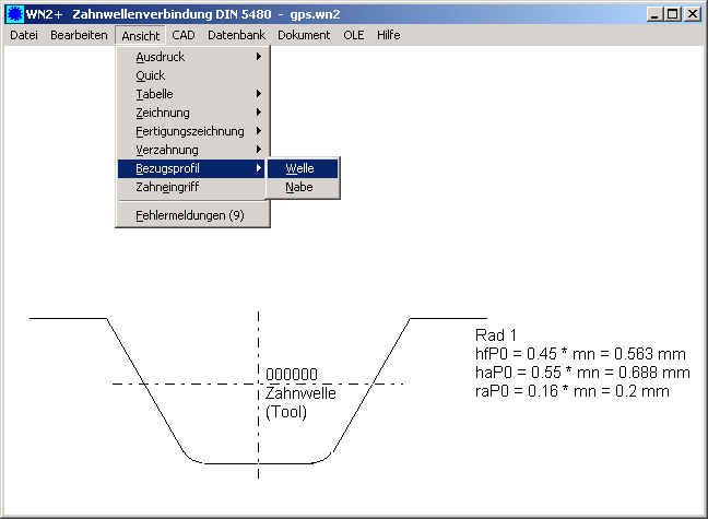 Das Ansicht-Menü wurde übersichtlicher strukturiert mit Untermenüs. Neu sind Zeichnungen des Bezugsprofils sowie technische Zeichnungen von Welle und Nabe.