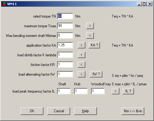 For recalculation according to DIN 6892, additionally enter peak torque Tmax, load distribution factor, friction factor (for press fits), additional bending moment, load alternating factor and load peak frequency factors. Support factors fS and hardness factors fH are loaded from material database. WN11 calculates safety margins against permissible pressure by maximum and equivalent torque on Woodruff key, shaft and hub.