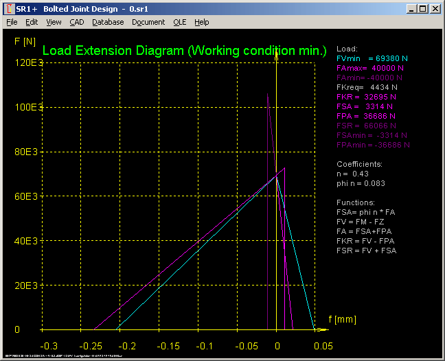 An additional load-extension diagram shows load and deflections on minimum torque or minimum clamping force. Axial force FA (also FAu, if pressure) is drawn in the diagram, residual clamping load FKR or FSR may be obtained from the intersection of the magenta lines.