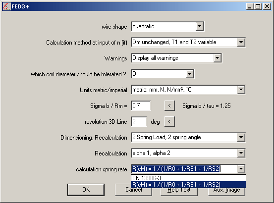 In 2008, some materials had been updated with material data according to EN standards (see HEXAGON info letters 108 and 110). For spring wire 1.4310, E modulus was changed from 195000 into 190000, and for wire 1.4401 from 190000 into 185000. If you open old calculations with springs of 1.4310 or 1.4401, software recalculates number of coils. On a helical compression spring, you would hardly notice the changes. In case of a torsion spring, however, even small change in coils results in large changes of the leg angles delta, so that the torsion spring drawing seems completely different on a glance. If, for example, number of coils changed from 3.5 into 3.4, leg angles enlarge 36° (i.e. delta0 from 180° into 216°). To adapt old calculations with new material data, you can change back delta2 at "Edit->Dimensioning", then save file. If torque must remain unchanged, you have to adopt coil diameter instead.
