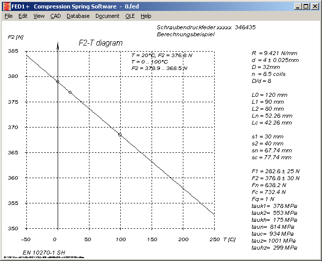 Numerical values of shear modulus and spring load F1, F2 for calculated temperature as well as for min and max value of defined temperature range have been added to the temperature diagrams.