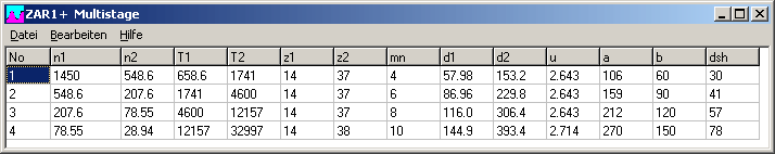 Eingegeben wird das Übersetzungsverhältnis und die Anzahl der Stufen. Dazu Leistung und Eingangsdrehzahl, den Werkstoff für alle Zahnräder kann man aus Datenbank wählen. Vorgabewerte für die Berechnung sind Zahnbreitenfaktor (b = 15 Modul) und die Sicherheiten gegen Zahnfußdauerbruch und Pitting. Aus diesen Angaben berechnet ZAR1+ die einzelnen Stufen, am Bildschirm erhält man eine Zeichnung einer ebenen Getriebeanordnung und eine Tabelle mit den Daten der einzelnen Stufen.