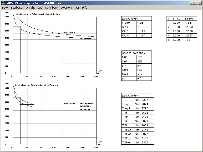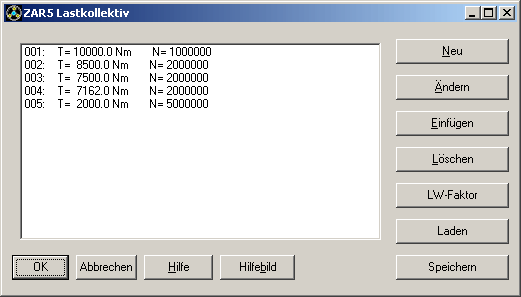 In ZAR5 kann man jetzt ähnlich wie in ZAR1+ ein Lastkollektiv eingeben. Dabei definiert man die Drehmomente an der Eingangswelle und die zugehörigen Umdrehungen der Welle. Also nicht die Lastspiele, weil dies beim Planetengetriebe am Sonnenrad und Hohlrad von der Anzahl der Planetenräder abhängt, und bei den Planetenrädern wechselnde statt schwellende Last auftritt. Dies ist aber bei der Festigkeitsberechnung bereits berücksichtigt.