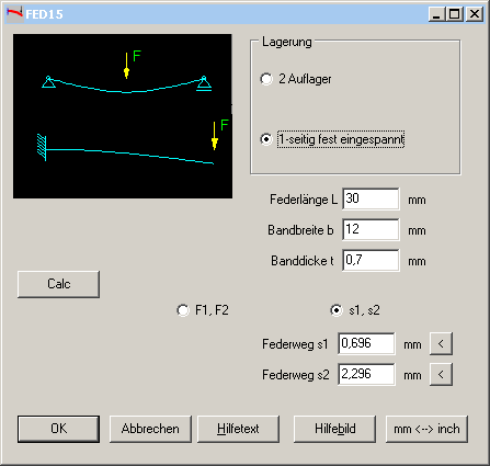 Mit FED15 kann man dagegen mit nur wenigen Eingaben sehr schnell einfache Blattfedern berechnen mit konstantem Rechteckquerschnitt und nur einer Federkraft und definierter Federrate. Während in FED10 die Lagerarten "Feste Einspannung" und "Fest/Loslager" mit 2,3, 4 oder 5 Auflagern möglich sind, gibt es in FED15 nur "Feste Einspannung" (z.B. Relaisfeder) oder Fest/Loslager mit 2 Lagerstellen (z.B. Fahrzeug-Blattfeder). Auch die Kraftangriffspunkte sind festgelegt: Bei fester Einspannung am Federende, und bei Fest-/Loslagerung in Federmitte. Dadurch erhält man eine feste Federrate, da nur 1 Federkraft und klar definierte Federwege an der Position des Kraftangriffpunkts. Die Eingabe in FED15 ist ähnlich wie bei den anderen Federprogrammen, mit Federwegen s1, s2 und zugehörigen Federkräften F1 und F2, wogegen die Eingabe der Blattfeder in FED10 vergleichbar ist mit der Wellenberechnung in WL1+ oder der Trägerberechnung TR1.