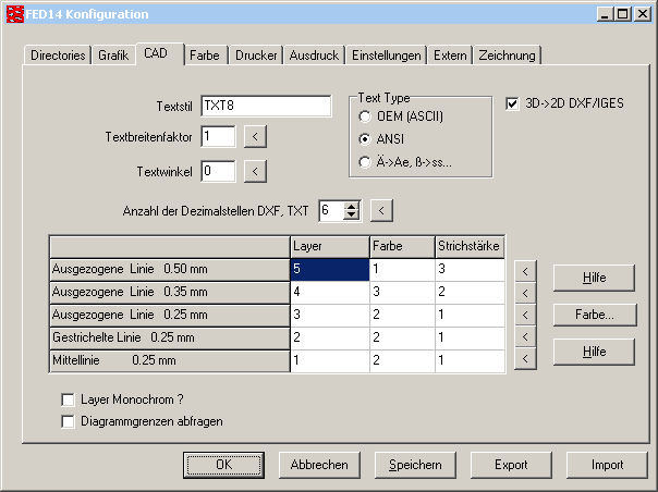 3D-Zeichnungen werden am Bildschirm in einem konfigurierbaren xyz-Koordinatensystem dargestellt, bei Export als DXF oder IGES-Datei dagegen 3-dimensional mit x.y.z-Koordinaten. Jetzt kann man konfigurieren unter "Datei->Einstellungen->CAD", daß die DXF- oder IGES-Datei 2-dimensional sein soll, genau so wie die Darstellung am Bildschirm. Sinn macht dies vor allem, wenn 3D-Zeichnungen in Fertigungszeichnung oder Quick-Ansichten enthalten ist.
